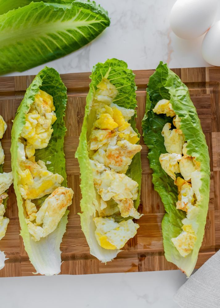 Spoon the chopped up egg mixture into each romaine lettuce leaf cup and place onto a plate.
