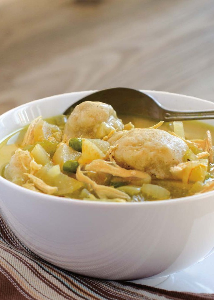 NOTE: These dumplings are very delicate, with 1½ cups broth in the dough. This is the way we prefer them, but if you would like a firmer, less delicate dumpling, then use only 1¼ cups broth. For a more foodie, puristy version of this soup, you can cook a whole chicken in the soup pot earlier in the day. Add 2 quarts plus 3 cups water and the chicken. Add 1 tablespoon apple cider vinegar, bring to a boil, and then cover and simmer long and slow until the chicken is tender.