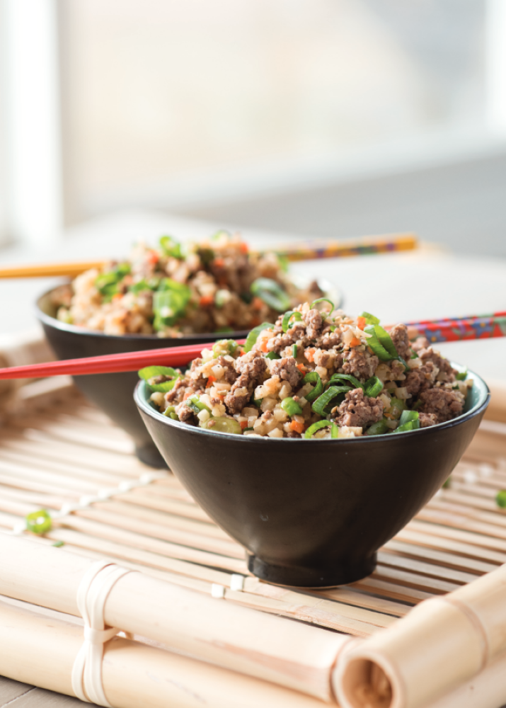 Another fast and yummy way to use riced veggies! The original Egg Roll in a Bowl was one of the biggest hits in Trim Healthy Mama Cookbook. Now we bring you part deux. Let’s change things up, nix the cabbage, and make use of our new best friend riced cauliflower. You can get a frozen riced cauliflower medley at most grocery stores these days, which is a mix of cauliflower with a few riced carrots and peas added (read about how to make your own on page 36). This recipe is found in the “Speedy Skillet Meals” section of Trim Healthy Table Cookbook, page 63. This recipe is a family-serve recipe that feeds 6 to 8 people.