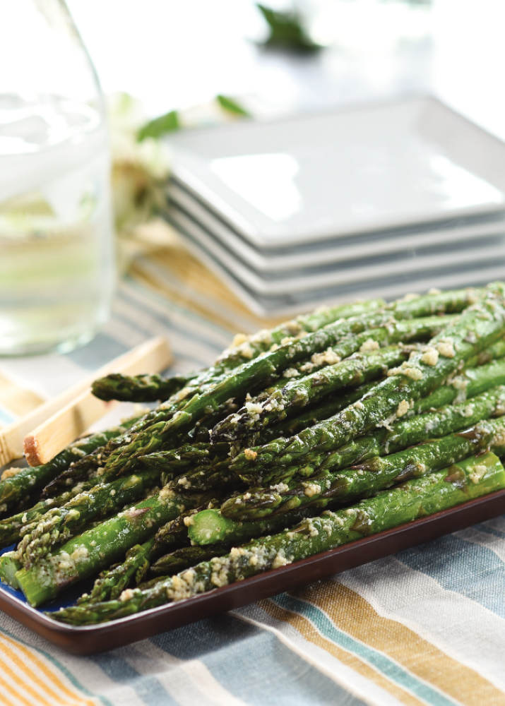 Drizzle the melted butter or oil over the asparagus. Season with salt and pepper and sprinkle on the garlic and Parmesan. Using your hands, mix the asparagus with the butter and the rest of the ingredients, then lay them out in a single layer again. Bake for 9 to 10 minutes.