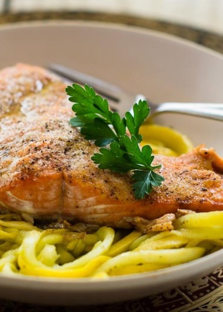 If you desire a FP salmon lunch, it may be accompanied by salad with a light vinaigrette. If you are looking for an E lunch, enjoy the salad with light vinaigrette and 3/4 cup pre-cooked brown rice or quinoa. Alternatively, you could throw some garbanzo beans in your salad or place the grilled salmon n a piece or two of plan-approved bread. Another option is a sweet potato with only 1 teaspoon coconut oil on it and either Bragg's Liquid Aminos and cayenne for a savory flavor, or THM Sweet Blend and cinnamon to make it sweet. For a S salmon lunch, enjoy a salad with full-fat dressing and shredded cheese, if desired.