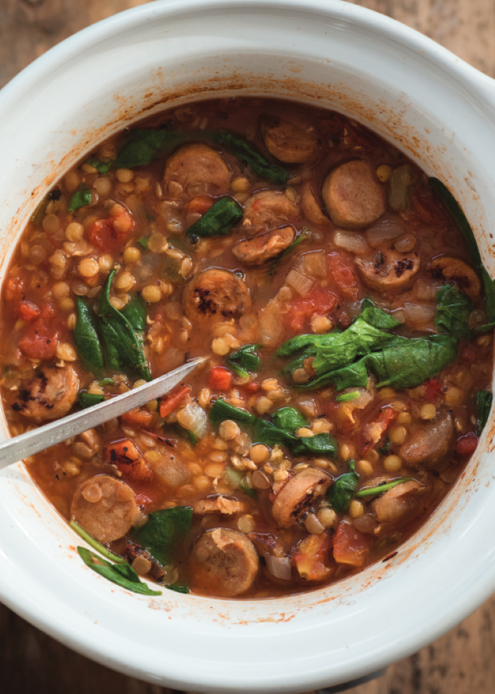 Hearty Lentil, Chicken Sausage, and Spinach Soup