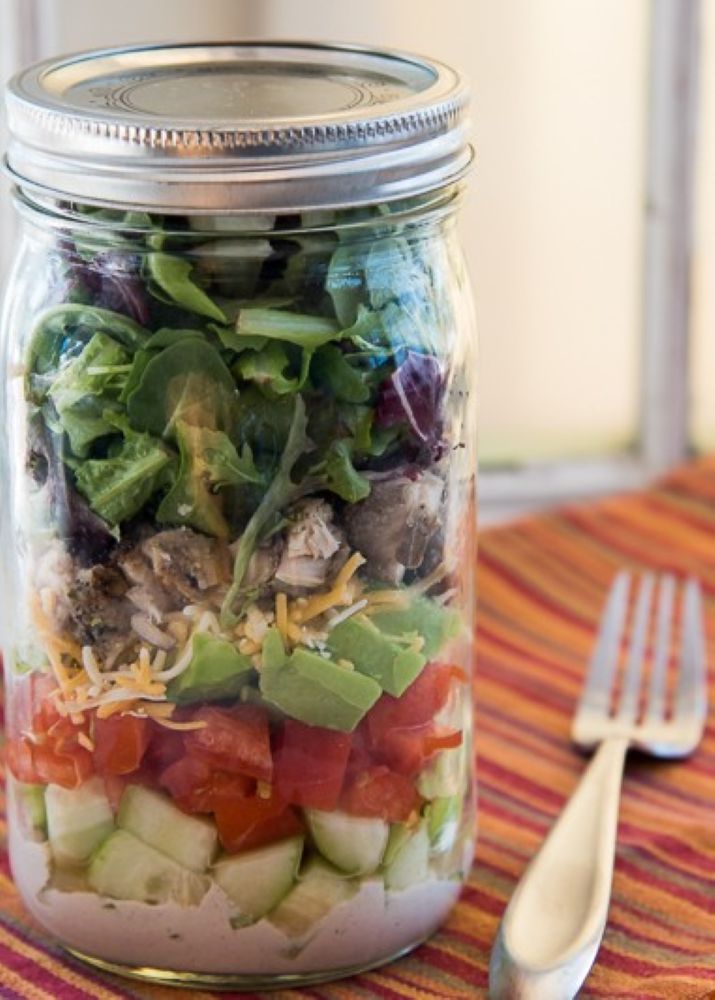 Note: It’s important to follow the order of directions rather than just throwing salad stuff in a jar. These salads work best when dressing goes first and lettuce goes last.