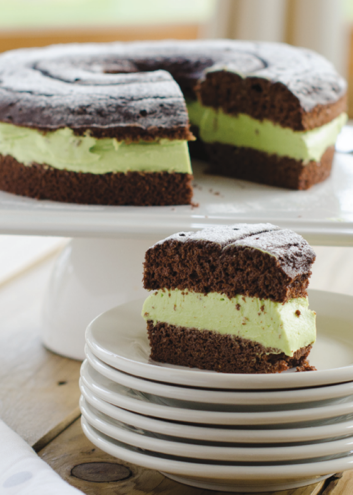 6. Place the cake on a cake stand or large plate and horizontally slice it in half, lifting the top half off. Spread a thick layer of the mint truffle on the bottom layer, then put the top back on. Sprinkle the cake with a light dusting of Gentle Sweet. Keep cake refrigerated.