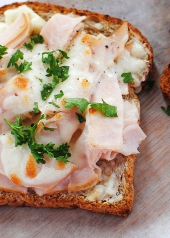 Bake on tray in the oven, or toaster oven, until cheese bubbles and melts. Sliced tomato could be used in place of, or alongside turkey, for this recipe.