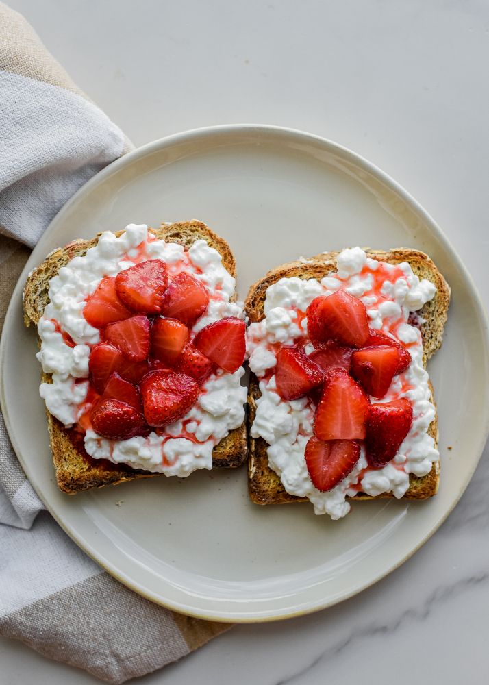 Spread some cottage cheese on each slice of toast then decide the strawberry mixture between the toast.