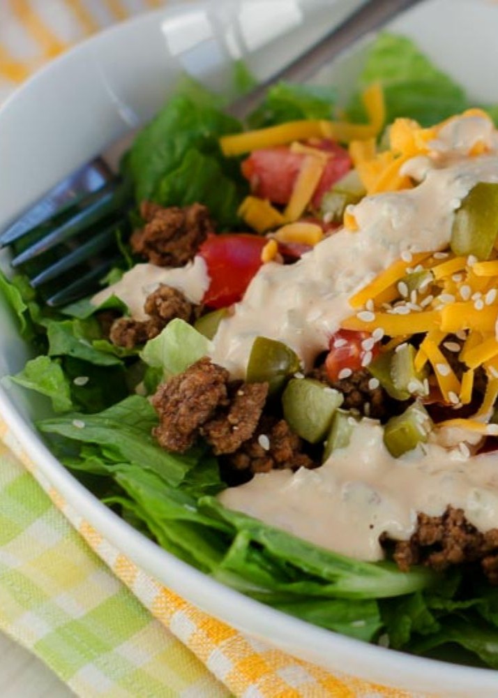 All the flavor of the most famous burger in the world, without the weight problems that can come with it. It’s all about that special sauce right? That’s a cinch when you use our Thousand Island Dressing on page 472. Now the whole family can sit down to the taste of fast food for dinne,r but you don’t have to fret about the health consequences. Do you have children who don’t want to eat salad? What a great way for children to learn to get addicted to salad with this yumminess like this. This recipe is found in the “Family Salads” section of our Trim Healthy Mama Cookbook. This is a family-size recipe that will serve 6 to 8 people.