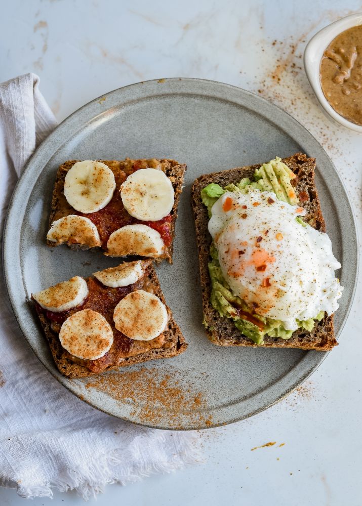 Sometimes, when it comes to lunch or snack time, I can’t decide between sweet and savory, but I also feel like eating bread. What’s a girl to do???!!!! Two Faced Toast is an open-faced toast concept that scratches all the sweet/savory/bready itches. It’s like skipping the responsible main part of a meal and taking the fun party approach… having an appetizer and a dessert instead. Thankfully, you’ll still get ample protein, and you’ll get filled up. It’s a win-win! Oh… in this recipe, you’ll notice I sprinkle the top of my banana-topped piece of toast with TH Mineral Salt; if that seems weird… salt on a banana… trust me… it’s amazing! Don’t forget to add some veg to the side of your plate. Cuke chips, which are just sliced cucumber topped with TH Nutritional Yeast and TH Mineral Salt, are always fabulous, or just enjoy a spoonful or two of sauerkraut or kimchi. You can use either on-plan sprouted store-bought bread (or see Pearl’s recommendations here for the sourdough rye bread she purchases) or enjoy home-made such as Serene’s Peasant Bread or the Gluten-Free Sourdough No Carb Easy Bread.)
