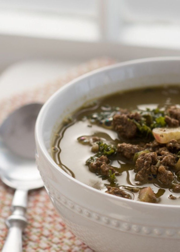 Pour this Trimmy bisque cream into your pot. With a slotted spoon, fish out all of the greens and place it in the same blender, adding enough of the broth to blend until perfectly silky smooth, before returning to the pot. Add the chopped radishes and radish greens or extra kale. Bring back to a quick boil, then turn down to a simmer. Add the meat and cook until the radishes are tender. Taste and adjust the flavors to “own it.”