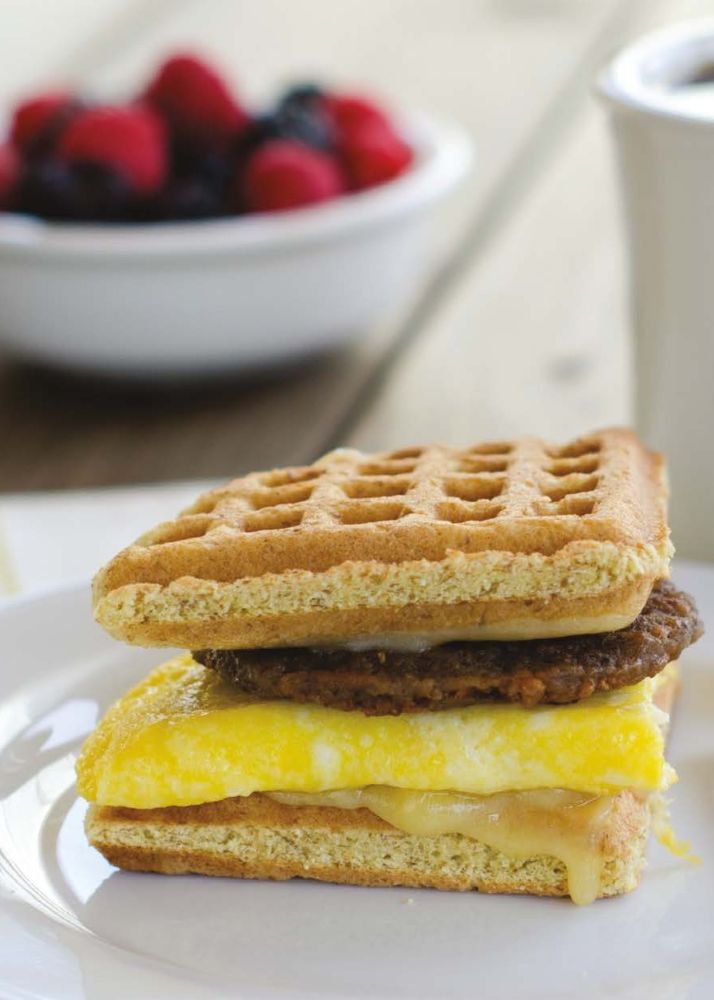 "If you want to make a breakfast sandwich with 2 waffles(as in the Waffleized Breakky Sandwich, page 241), omit the egg, vanilla, and sweetener. Use ¼ cup egg whites in place of the egg, since you’ll be using a whole egg in your sandwich. You can also add any savory flavorings of your choice, like grated Parmesan cheese, onion or garlic powder, or crumbled dried rosemary."